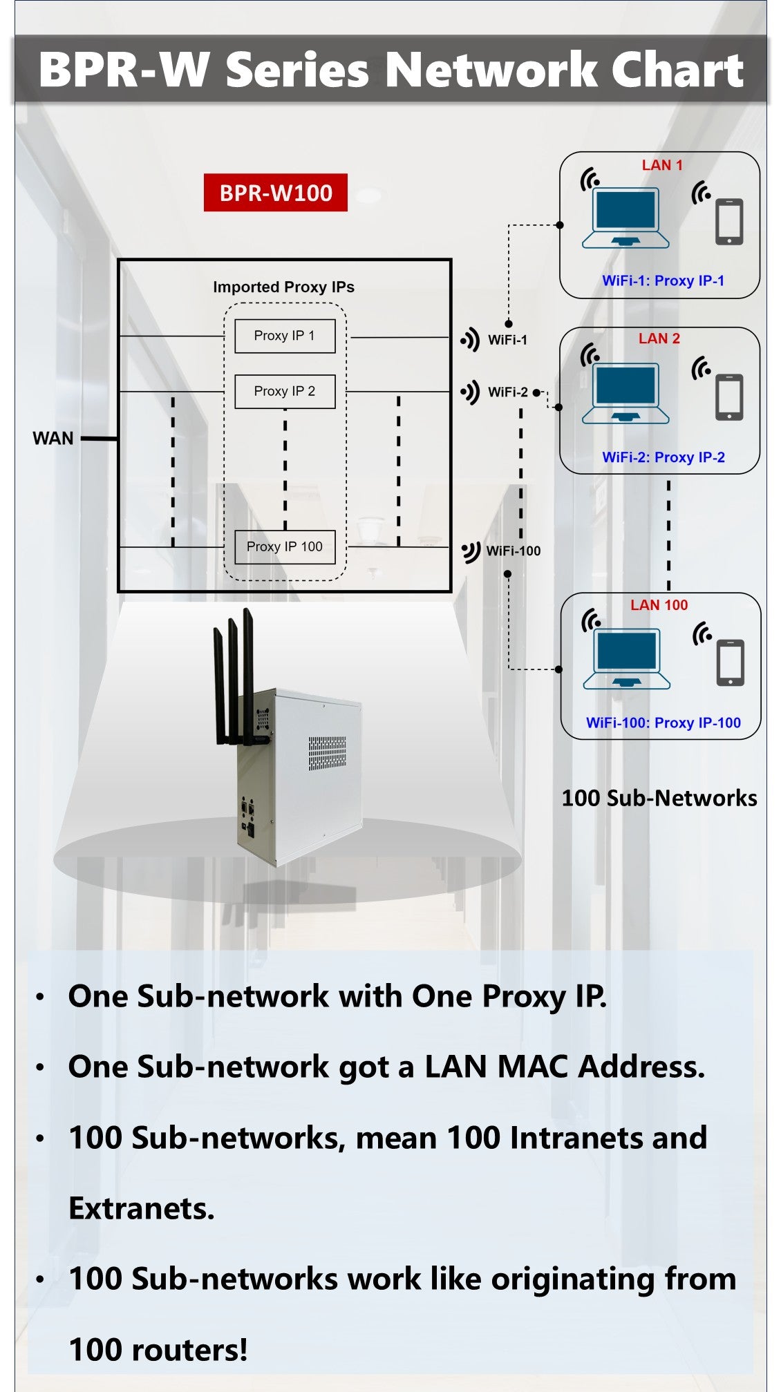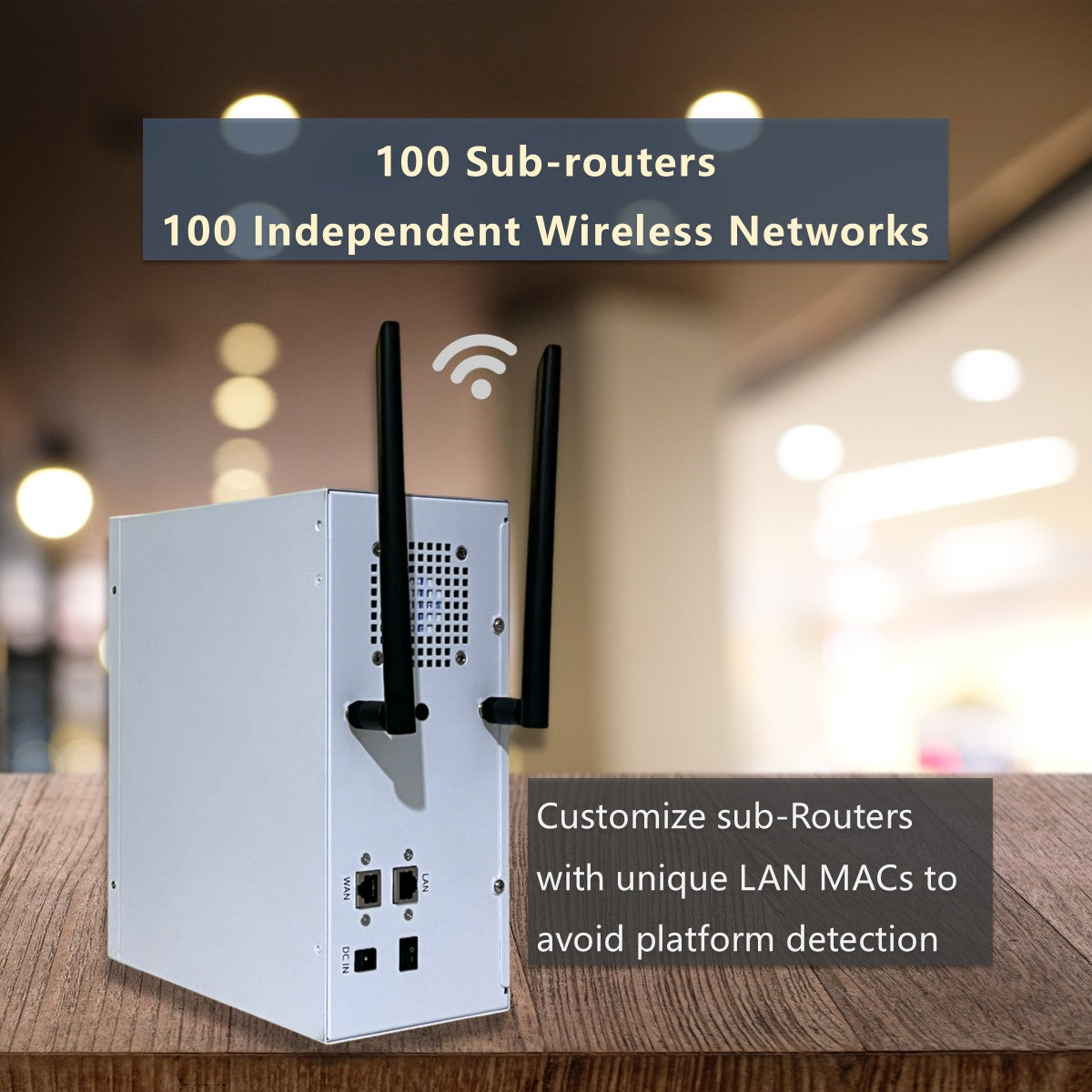 So, 100 sub-routers, 100 SSIDs, 100 proxy IPs!